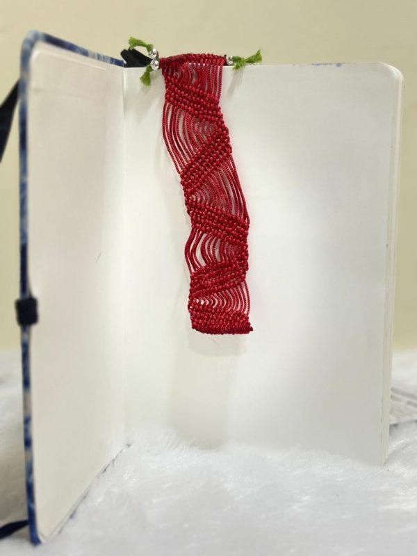 Handmade macramé thread bookmark with intricate knotting, marking a stylish bohemian touch