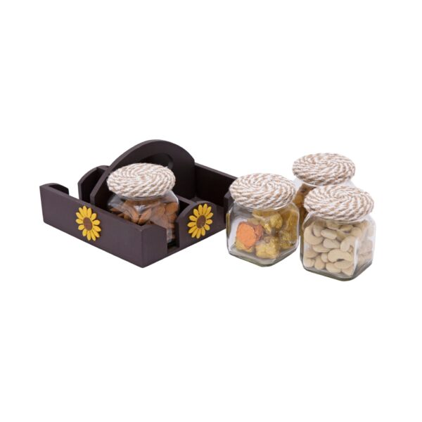 Dry fruits/chocolates packed in glass jars with jute braided lids and a sturdy wooden holder.