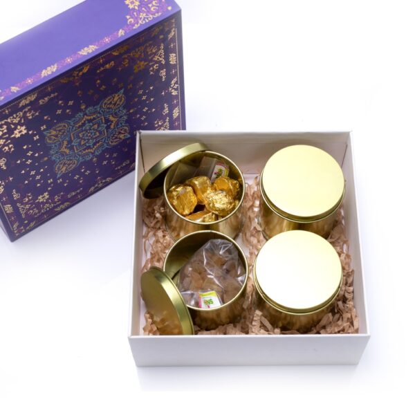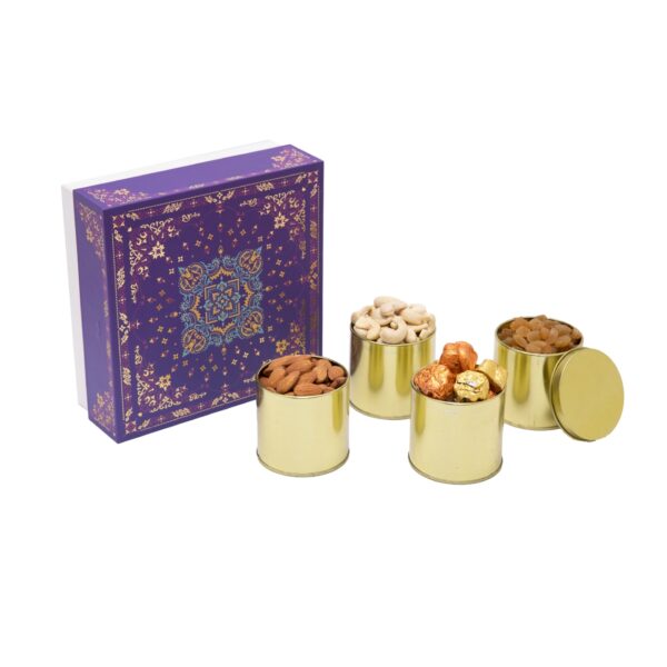 Dry fruits and chocolates in tin containers packed in a sturdy craft box.