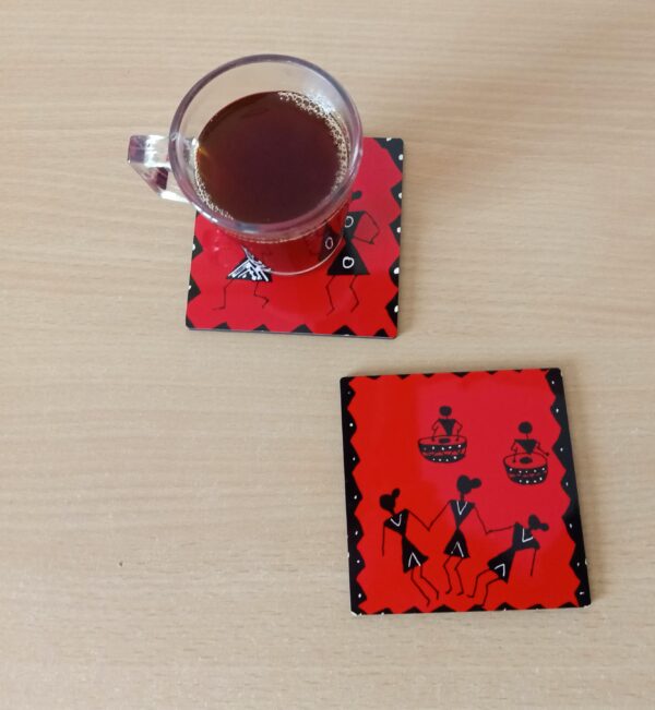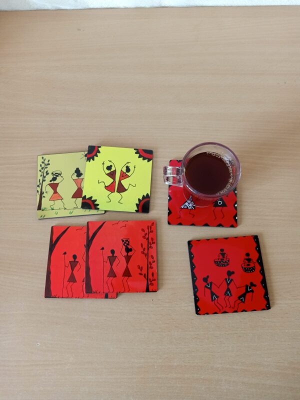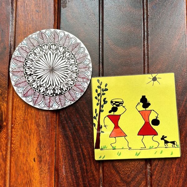 Fibre Coasters, crafted from durable fibre art sheets featuring intricate designs including Warli and Mandala art.