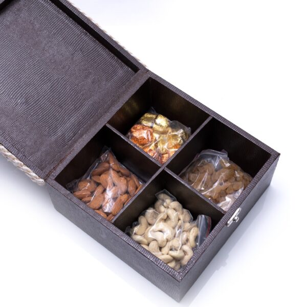 Dry fruits/chocolates in wooden box with jute detailing.