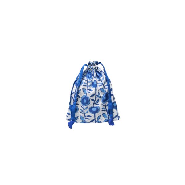 Indigo cotton potli with vibrant design print and sturdy drawstring, blending classic style with practicality.