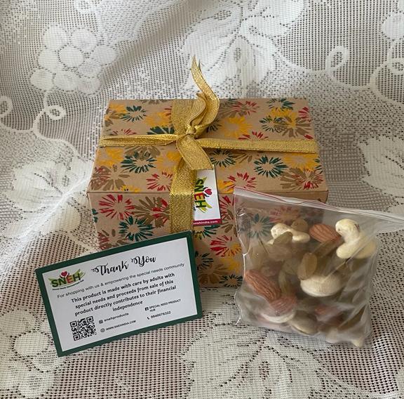 50 grams of dry fruits/chocolates packed in quality craft gift boxes.