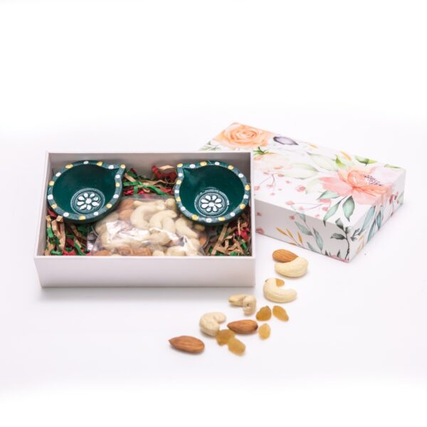 Dry fruits/chocolates in a cardboard box along with a pair of handpainted diyas.