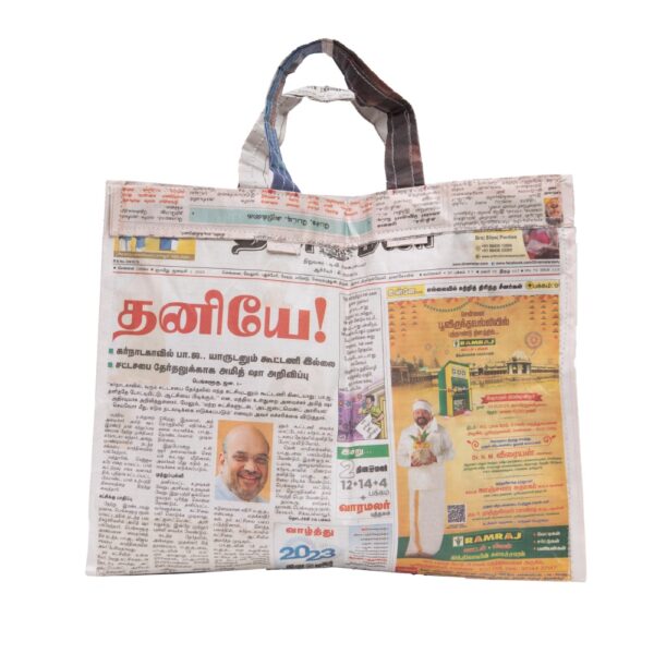 Sturdy and eco friendly paper bags made entirely out of newspapers with stitching for the edges.