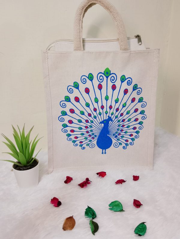 Stylish and spacious cotton bag featuring a vibrant peacock print, perfect for daily use or gifting