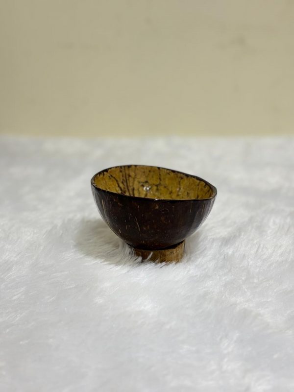 Buffed coconut shell bowl with rustic look an eco-friendly bamboo base.