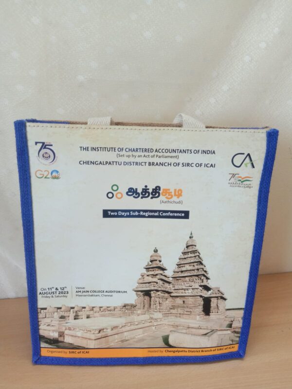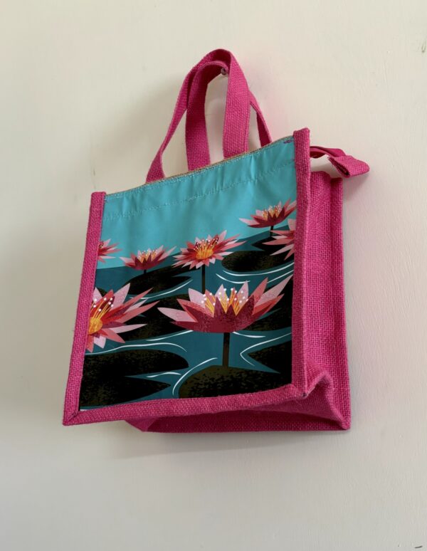 Exquisite jute tote bag featuring a vibrant digital print on a durable synthetic sheet. The high-quality canvas handle ensures sturdiness