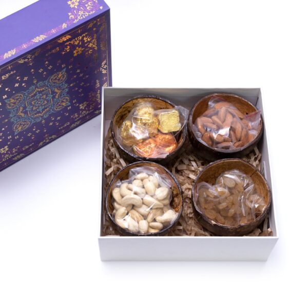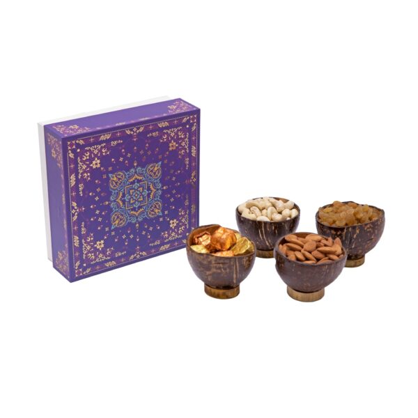 Dry fruits and chocolates in hand polished eco friendly coconut shell bowls, packed in a sturdy craft box.
