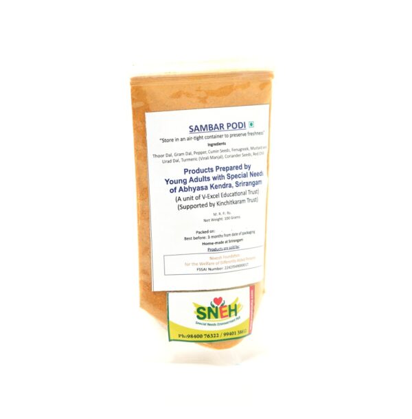 A blend of Thoor Dal, Gram Dal, Urad Dal, Tumeric(Virali Manjal}, Fenugreek, Mustard Seeds, Corinader Seeds & Red Chillies pow dered together which can be used to make Sambar instantly.