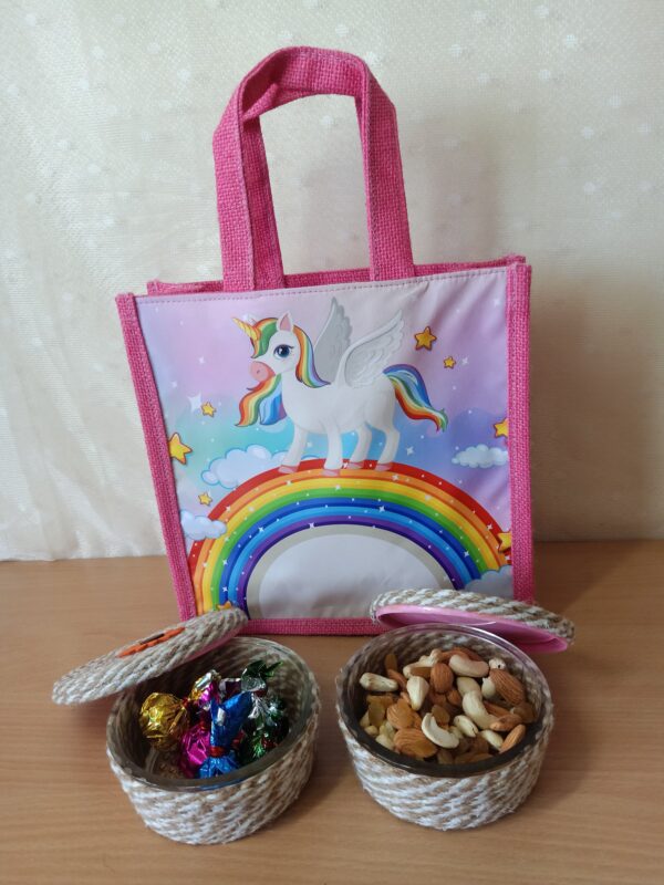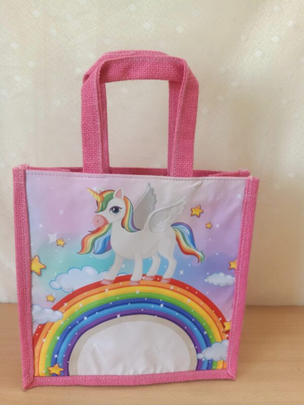 Exquisite jute unicorn bag featuring a vibrant digital print on a durable synthetic sheet. The high-quality Jute handle ensures sturdiness.